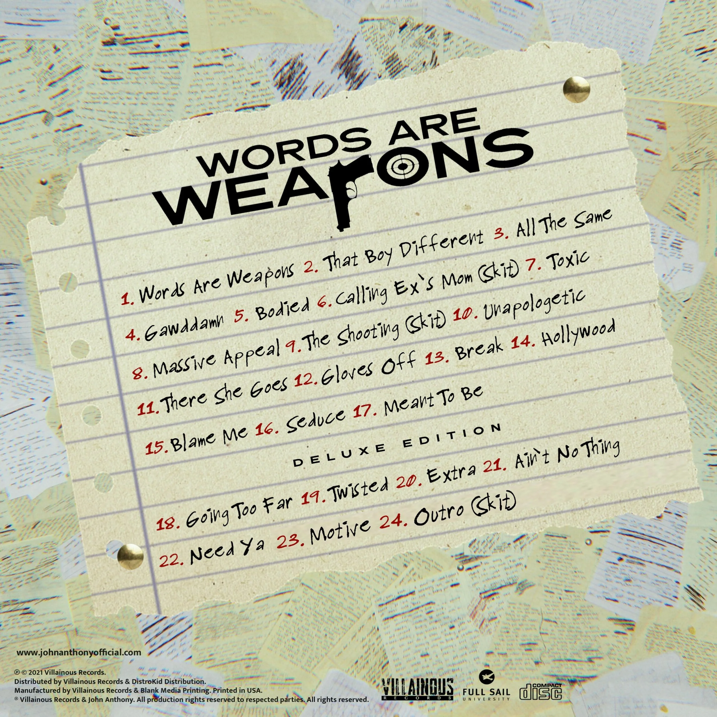 WAW Deluxe Edition cover + tracklist revealed. Mar 26 Written By Villainous Records The deluxe version of “Words Are Weapons” is set.Check out the first look at the alternative deluxe cover plus the seven extended tracks. You can pre-order both the Deluxe Edition and the Standard Version today! Both release April 9th everywhere! Villainous Records https://www.johnanthonyofficial.com